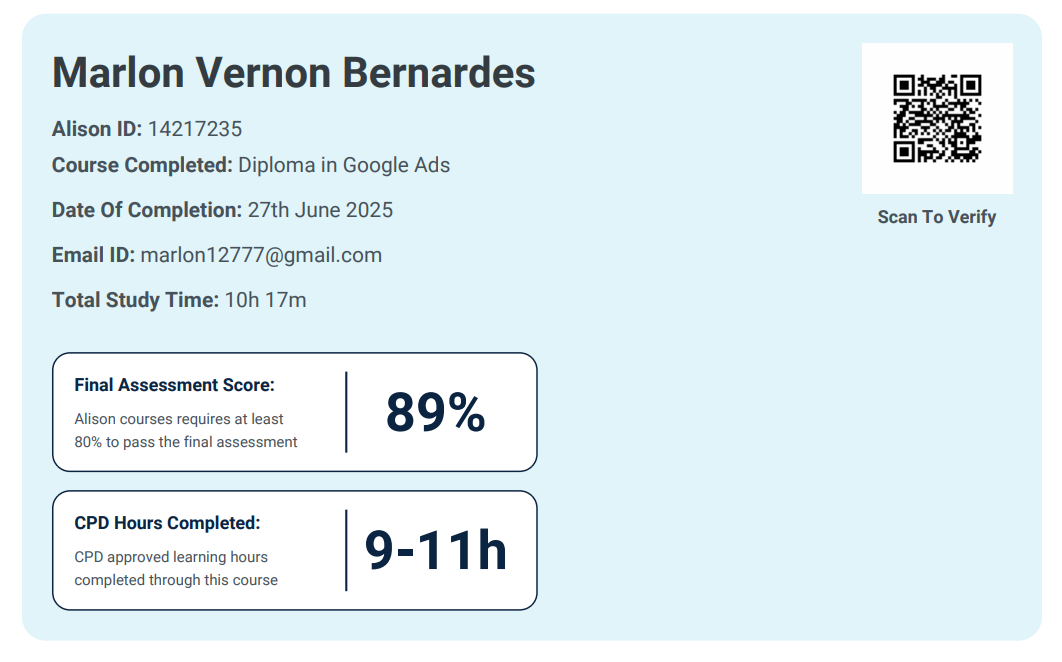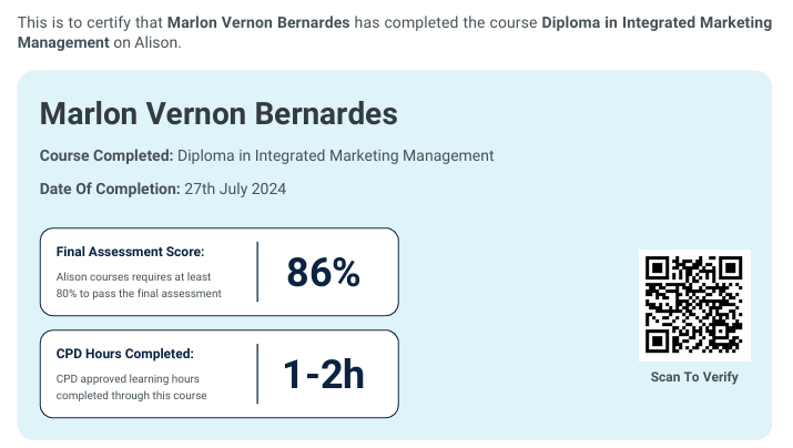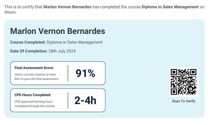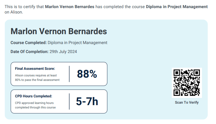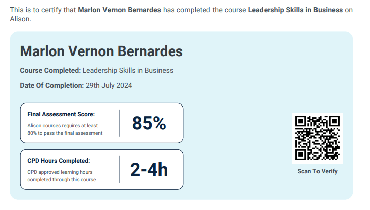 Certificate: Business Development (2025, Alison – Online) Certificate: Data for Business Intelligence (2025, Alison – Online) Diploma: Project Management (2019-2022, Alison – Online)