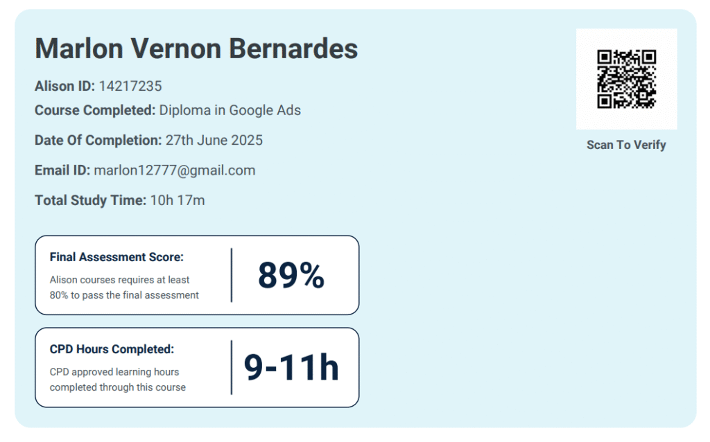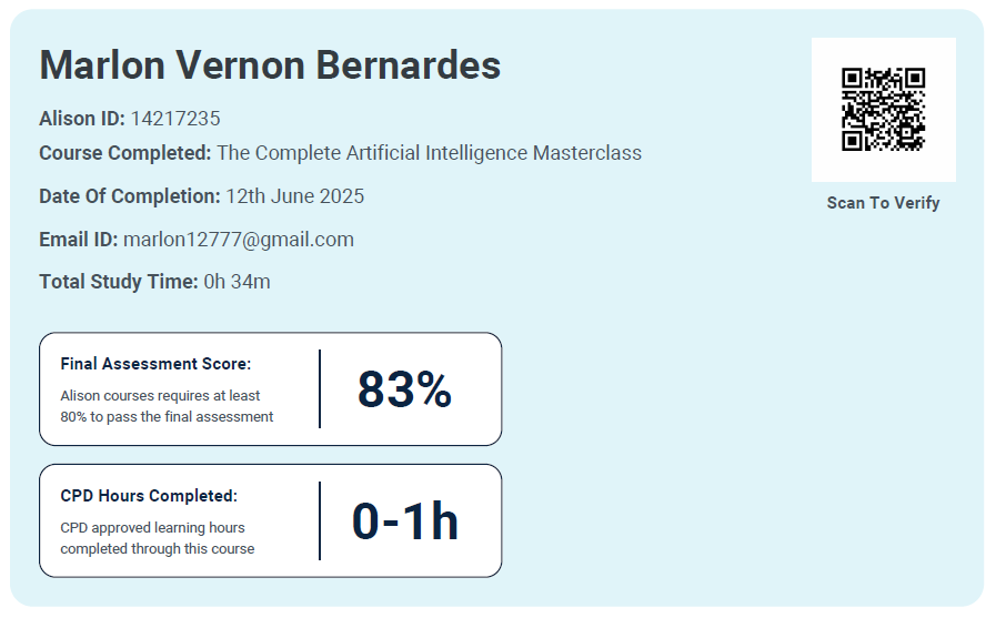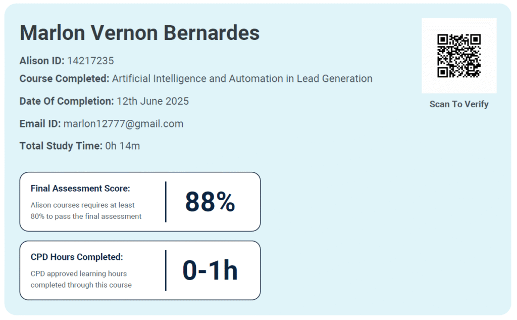 Certificate: Artificial Intelligence & Lead Gen Automation (2020-2022, Alison – Online)